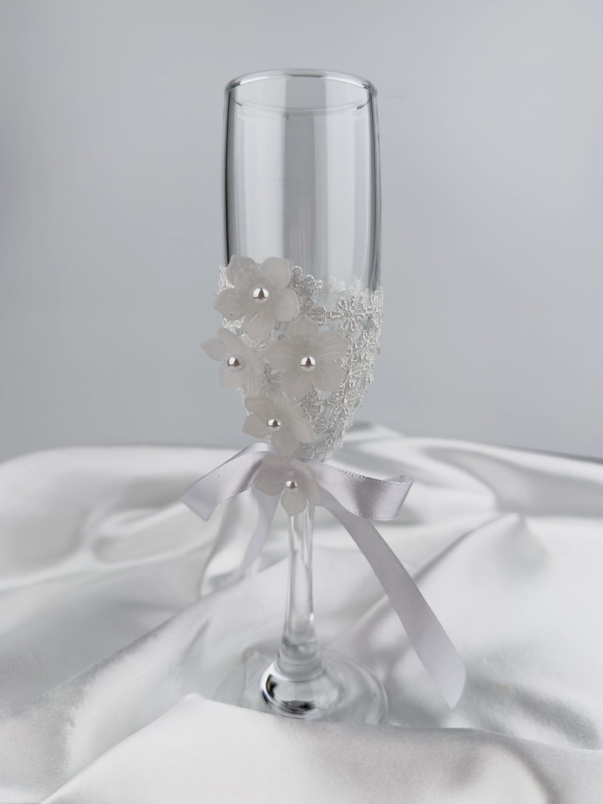 Glasen är dekorerade för hand med eleganta vita rosetter, skimrande pärldetaljer och gnistrande stenar som ger en lyxig och tidlös känsla.
