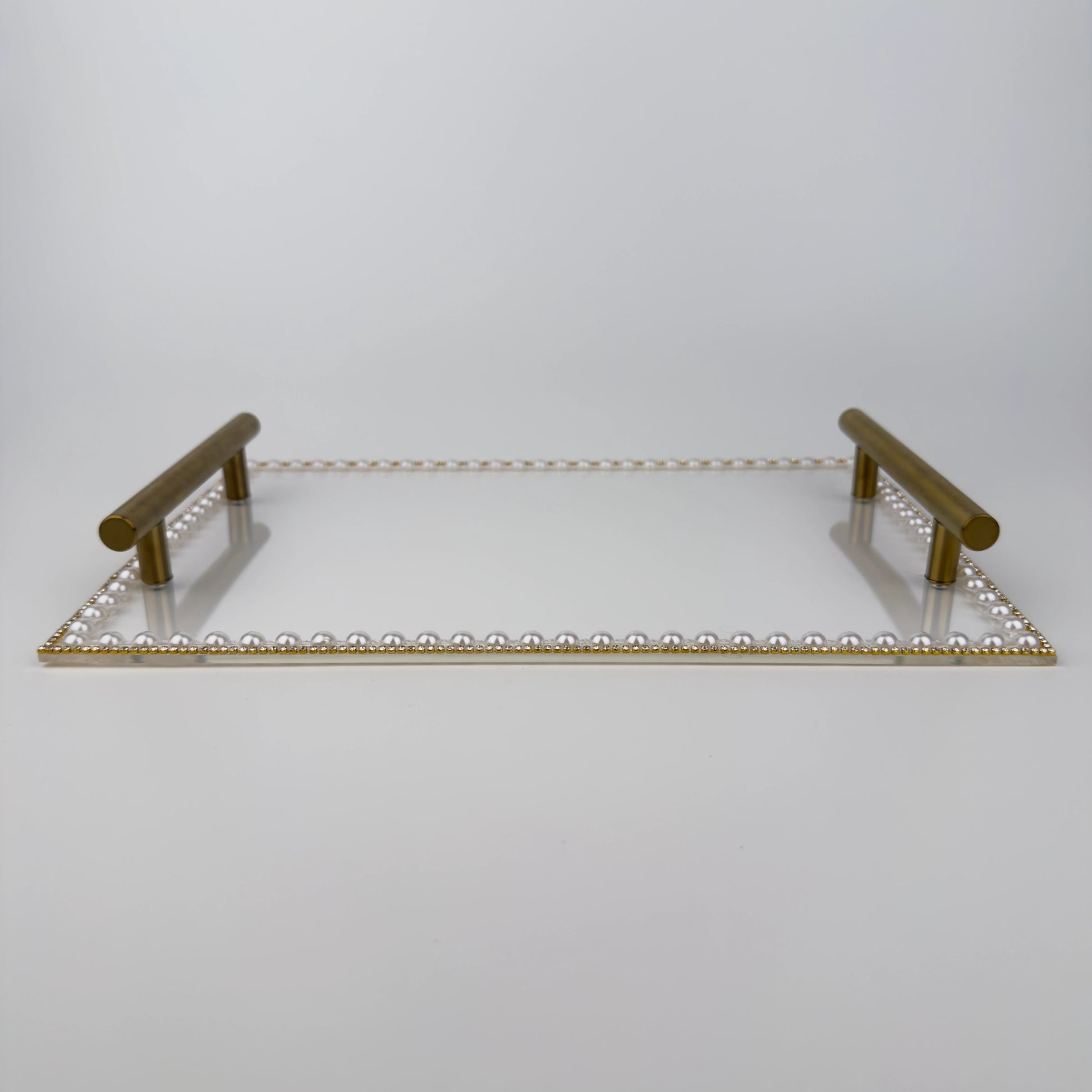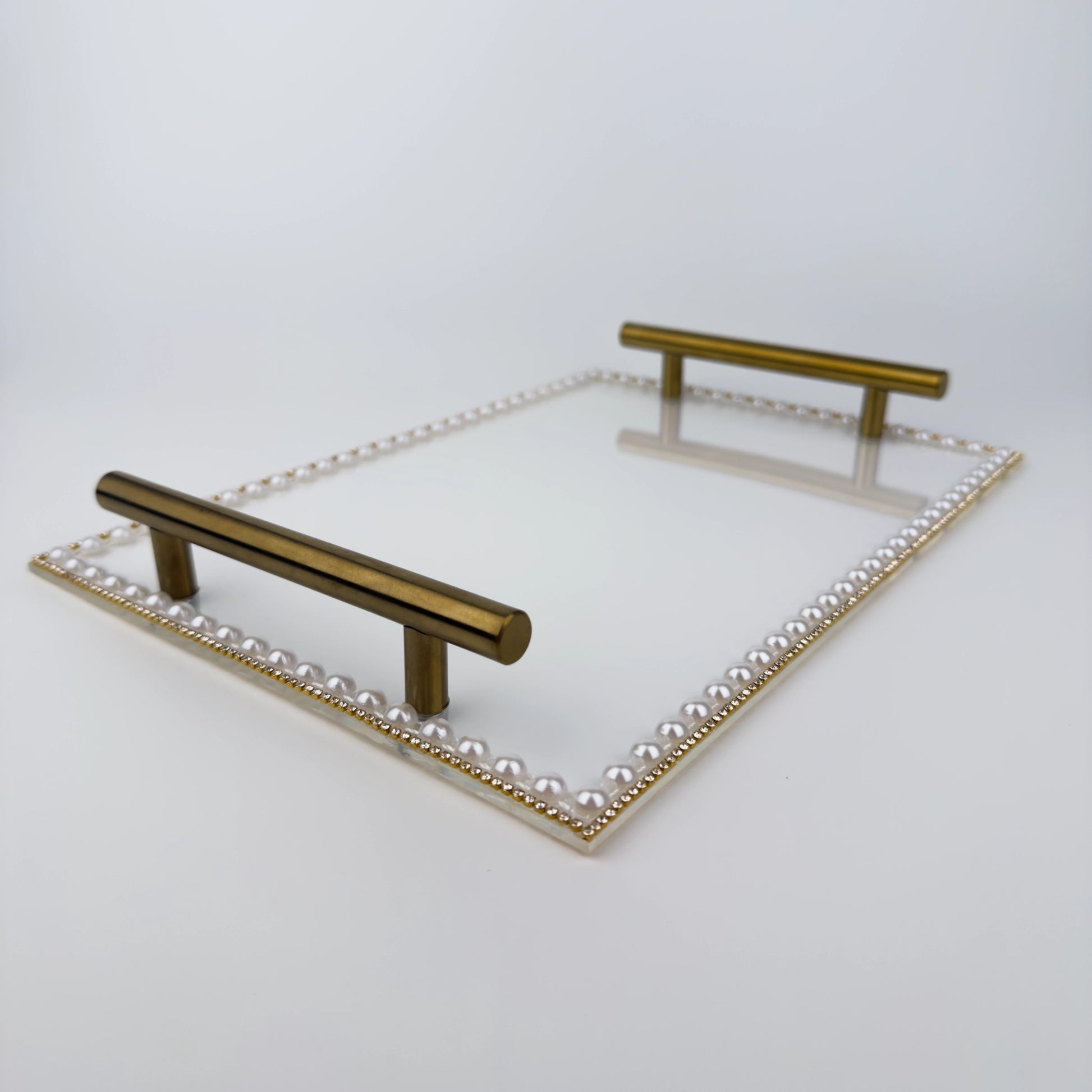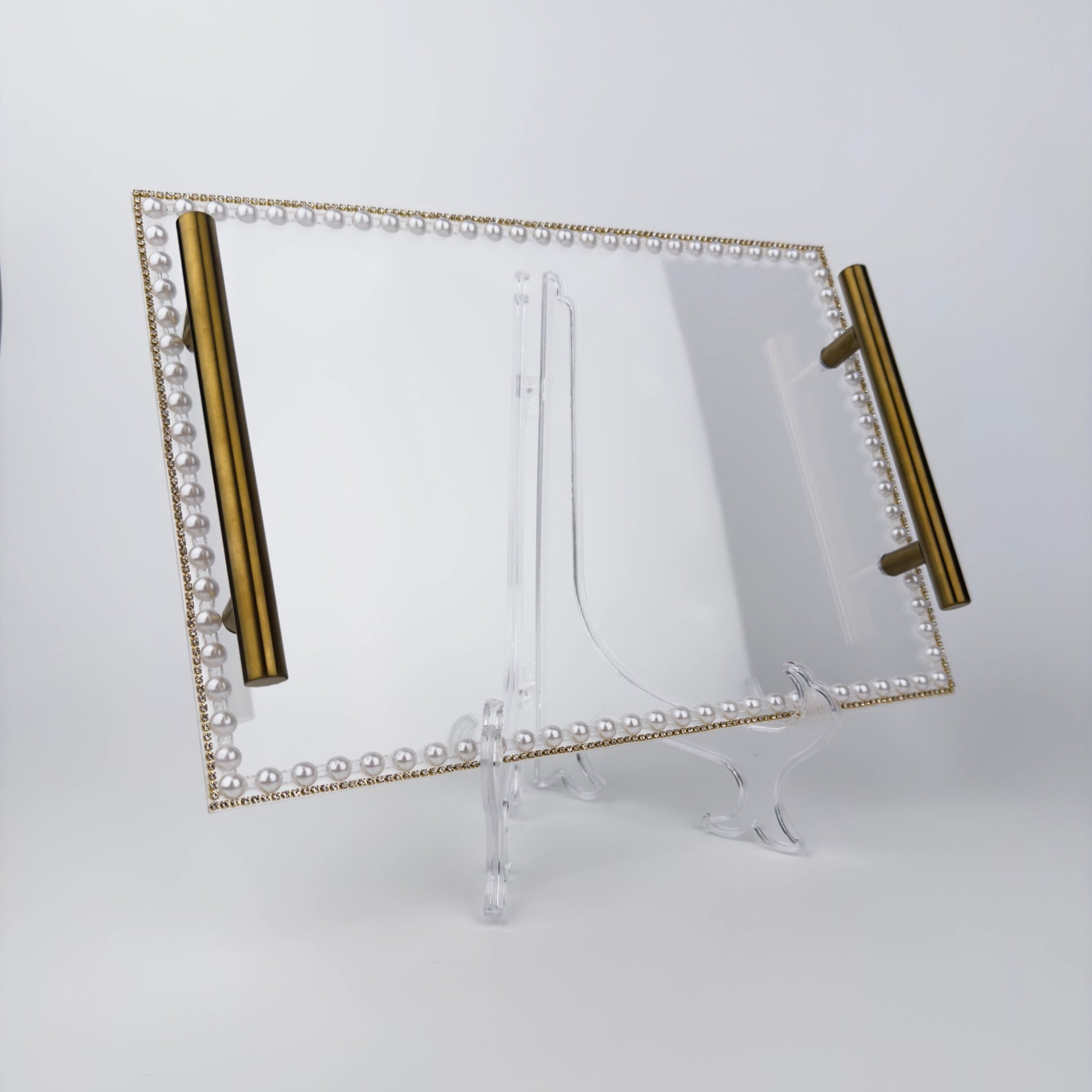 Brickan är utrustad med genomskinliga handtag med guldfärgade detaljer.  Passar utmärkt som exempelvis kaffebricka vid ceremonier, ringbricka, dekoration eller fotorekvisita.