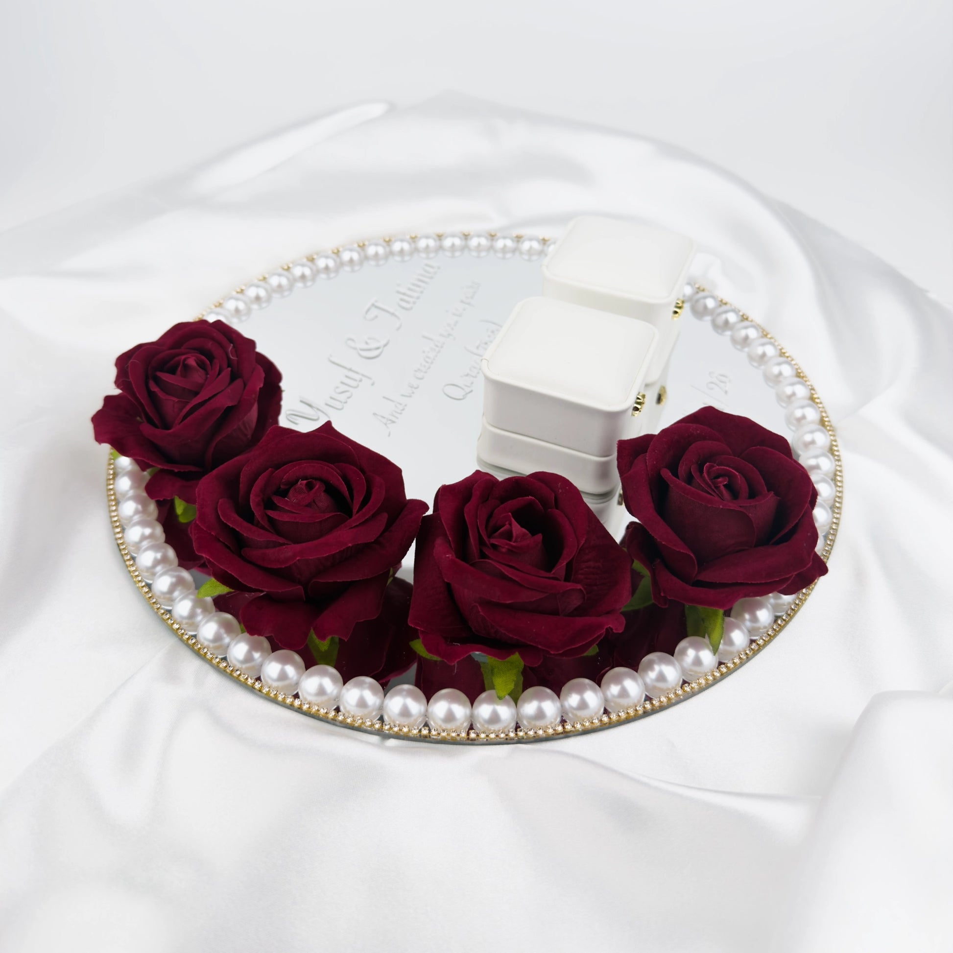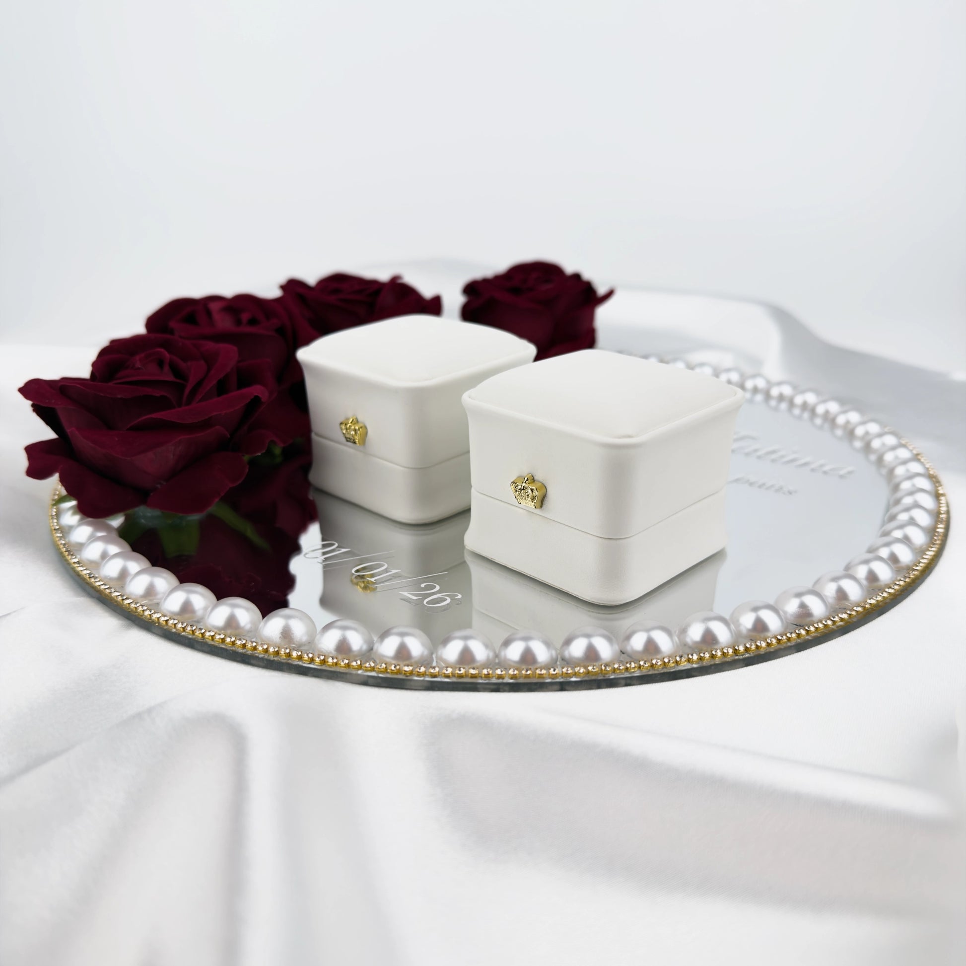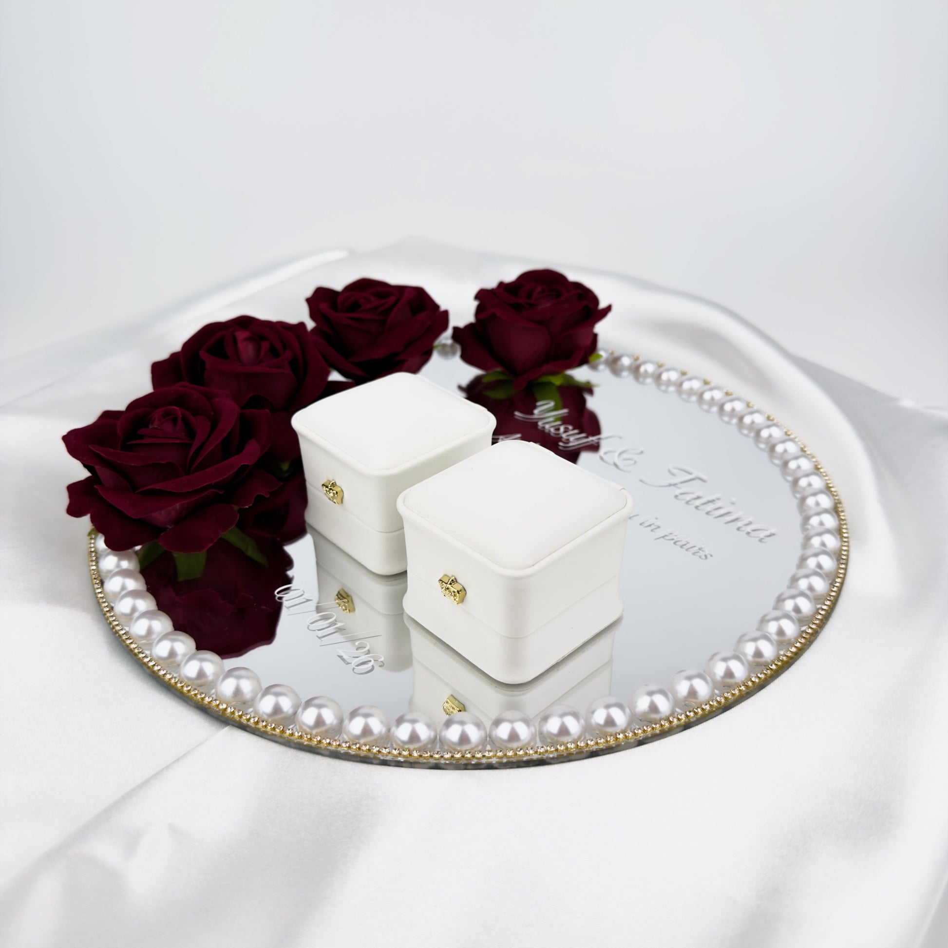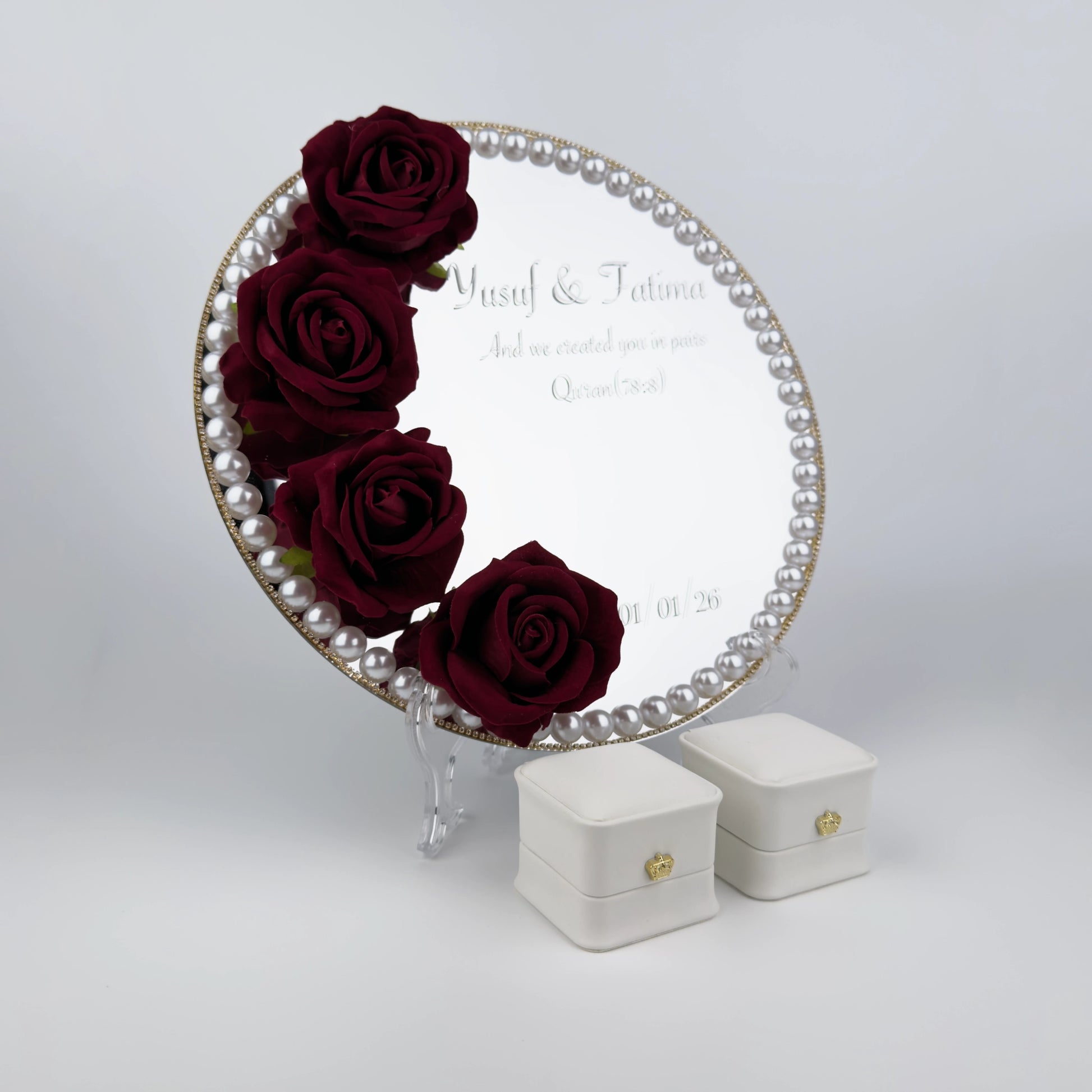 Våra handgjorda ringhållare är tillverkade i 3 mm tjock akrylspegel av hög kvalitet och dekorerade med noga utvalda blommor, vilket ger ett exklusivt och romantiskt uttryck under vigseln. Finns i storlekarna 25 eller 30 cm och kan dekoreras med valfri strass. Perfekt för vigsel, bröllopsfotografering och som minne efter er stora dag. En stilren och hållbar ringhållare som lyfter fram era vigselringar på ett vackert sätt.