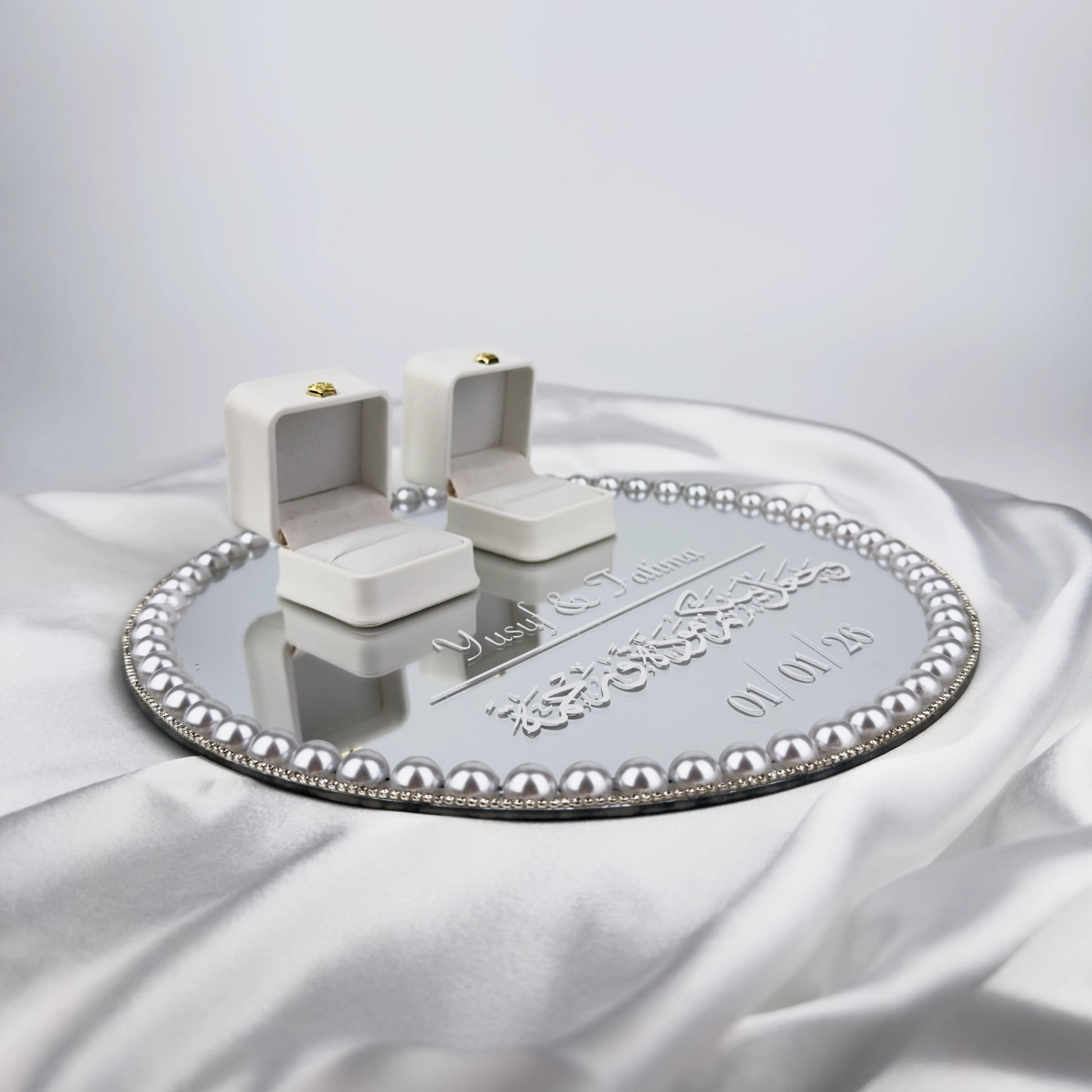 Våra handgjorda ringhållare är tillverkade i 3 mm tjock akrylspegel av hög kvalitet och dekorerade med noga utvalda blommor, vilket ger ett exklusivt och romantiskt uttryck under vigseln. Finns i storlekarna 25 eller 30 cm och kan dekoreras med valfri strass. Perfekt för vigsel, bröllopsfotografering och som minne efter er stora dag. En stilren och hållbar ringhållare som lyfter fram era vigselringar på ett vackert sätt.