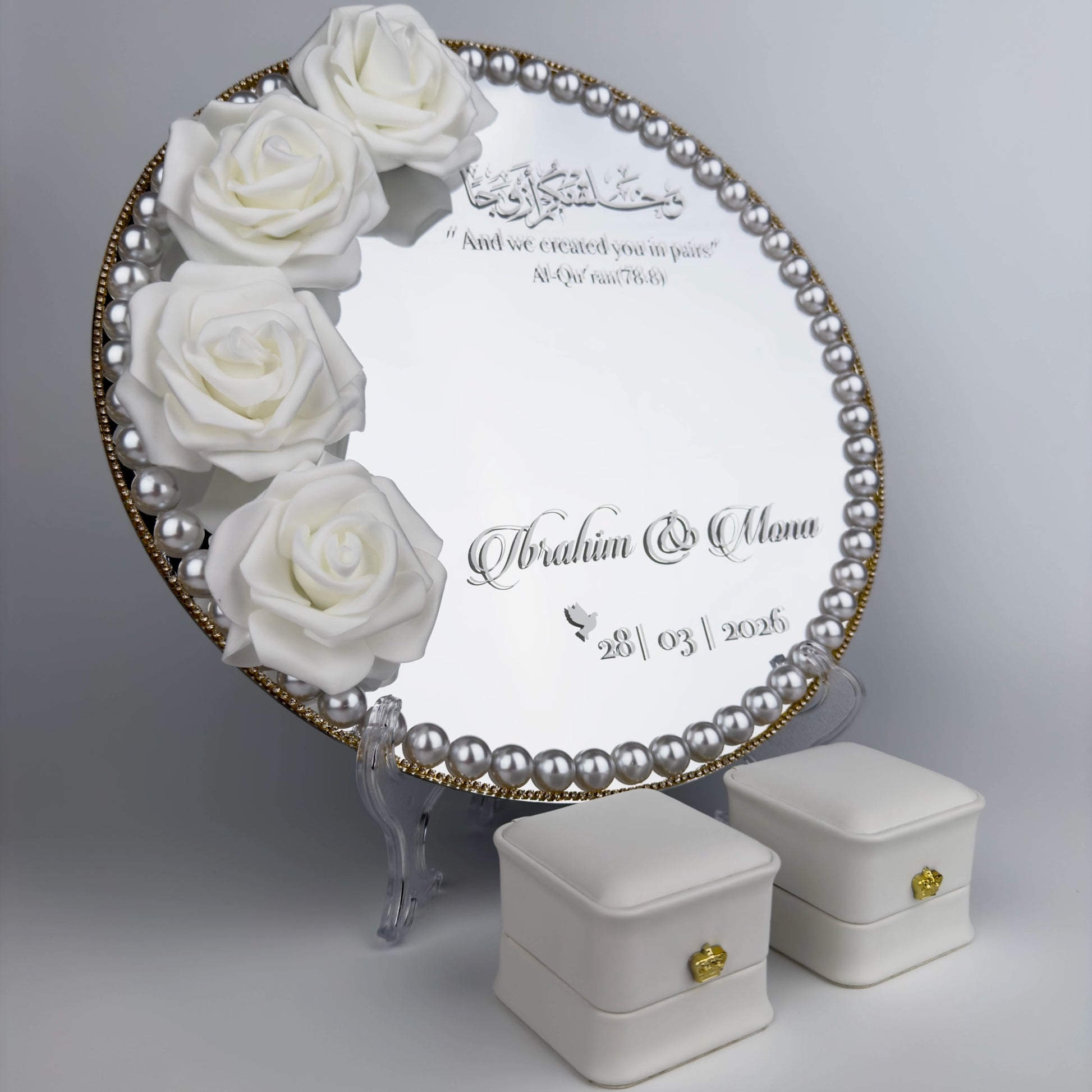 Våra handgjorda ringhållare är tillverkade i 3 mm tjock akrylspegel av hög kvalitet och dekorerade med noga utvalda blommor, vilket ger ett exklusivt och romantiskt uttryck under vigseln. Finns i storlekarna 25 eller 30 cm och kan dekoreras med valfri strass. Perfekt för vigsel, bröllopsfotografering och som minne efter er stora dag. En stilren och hållbar ringhållare som lyfter fram era vigselringar på ett vackert sätt.