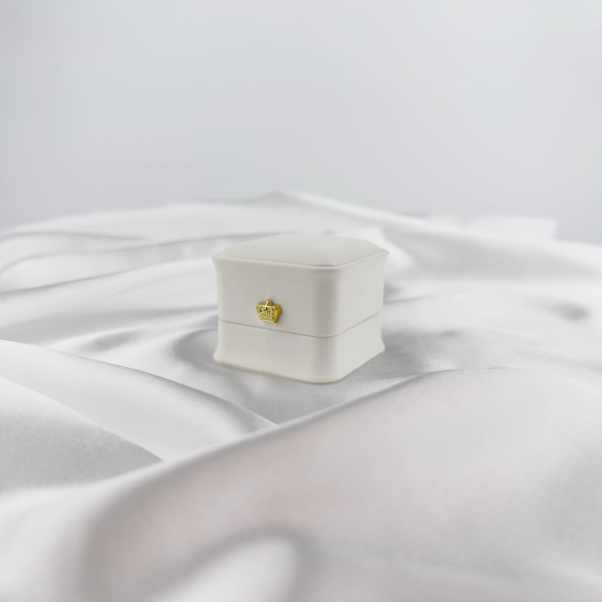 Denna stilrena och lyxiga ringask har en matt vit läderfinish och en mjuk insida som skyddar och lyfter fram ringen på ett vackert sätt. Perfekt att använda vid frieri, bröllop, förlovning, fotografering eller som en exklusiv presentförpackning.