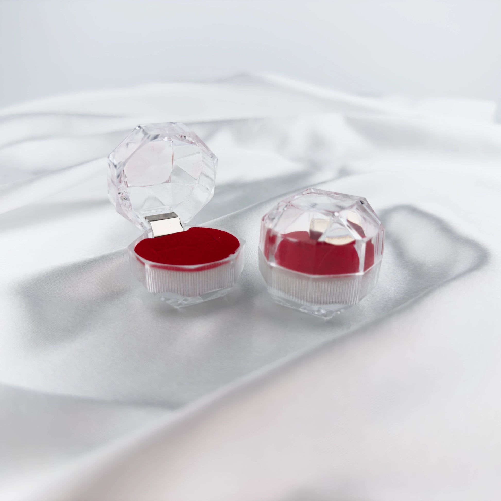 Ge din ring en lyxig presentation med denna eleganta, diamantformade ringask. Asken är tillverkad i kristallklar plast som ger ett exklusivt gnistrande uttryck, medan den mjuka röda insidan lyfter fram ringen på ett romantiskt och professionellt sätt.